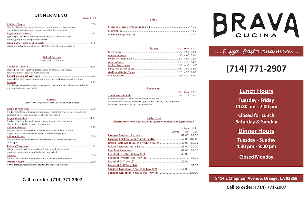 If you're on the hunt for authentic Italian cuisine that hits all the right notes, look no further than Brava Cucina. Nestled in Orange, California, this charming eatery offers a delightful take on classic Italian favorites, all lovingly prepared with the freshest ingredients. The inviting atmosphere is perfect for casual dining with friends or family, but the focus here is undeniably on taking home mouth-watering meals that you'll rave about long after the last bite.
